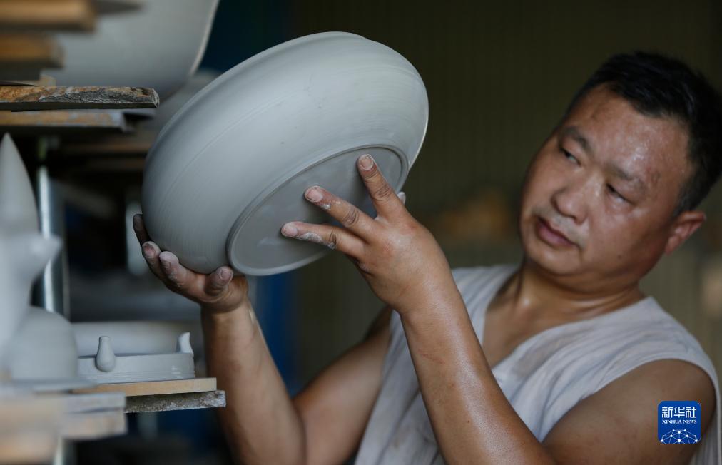 8月31日,在清涼寺村的一家汝瓷生産企業,汝瓷藝人劉國和在車間裏查看素坯。