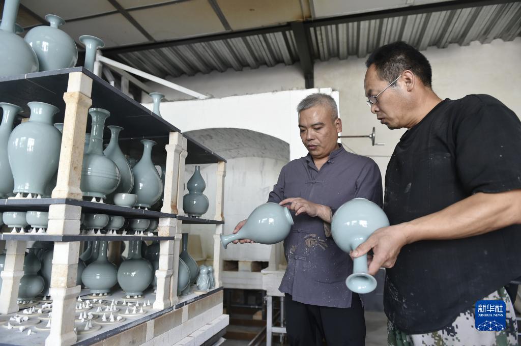 8月31日,在清涼寺村的一家汝瓷生産企業,汝瓷藝人王佔穩(左)和工人在車間裏檢查燒制完成的汝瓷産品。