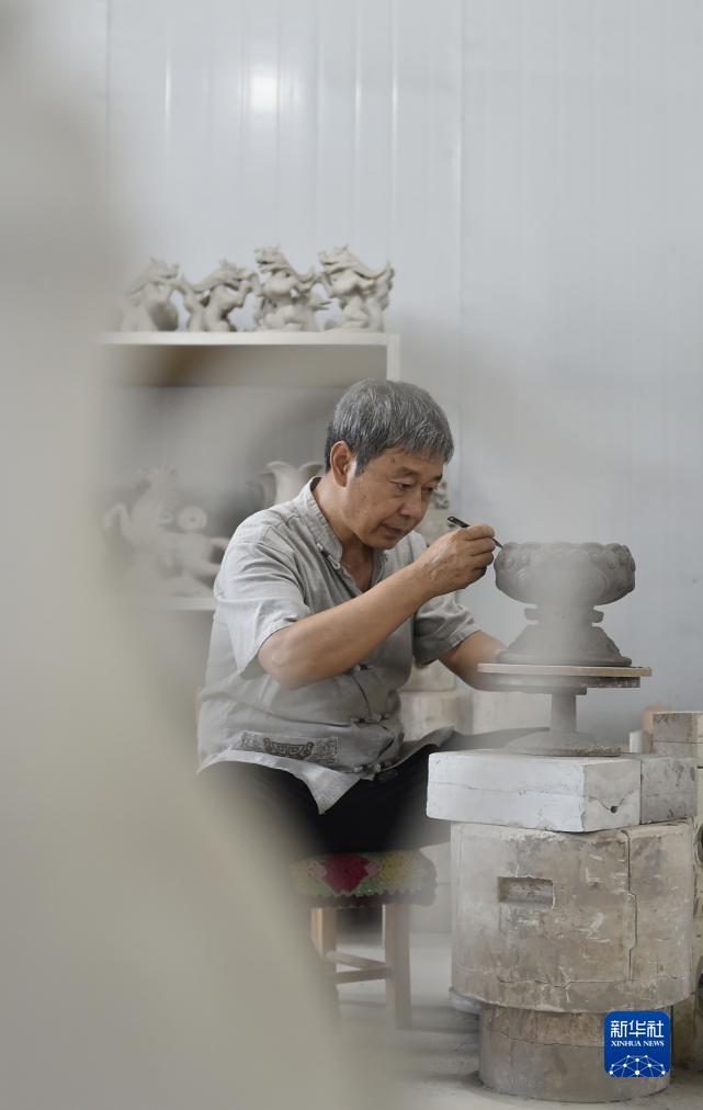 8月31日,在清涼寺村的一家汝瓷生産企業,汝瓷藝人王國奇在車間裏修坯。