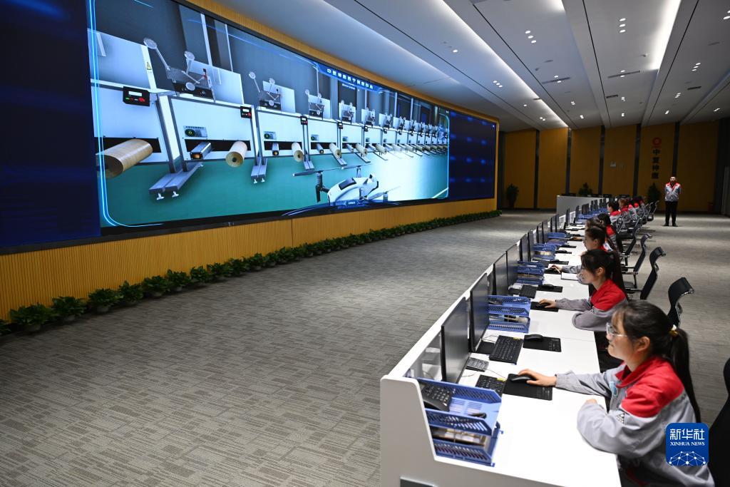 在中國建材集團西寧萬噸碳纖維生産基地中控室,工作人員監測生産線運行情況(8月27日攝)。