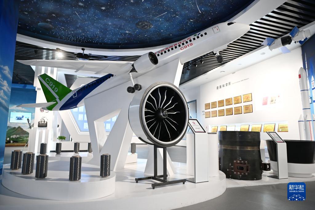 這是中國建材集團西寧萬噸碳纖維生産基地展廳內展示的碳纖維在航空領域的應用(8月27日攝)。