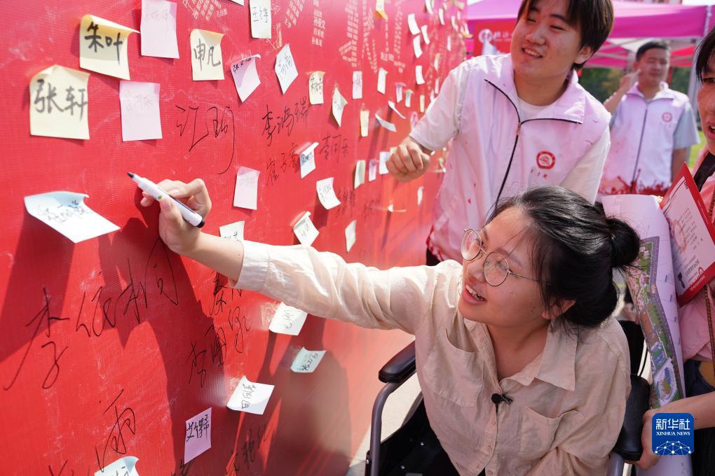 入校登記後蔣張子怡在簽名墻上留名(9月1日攝)。