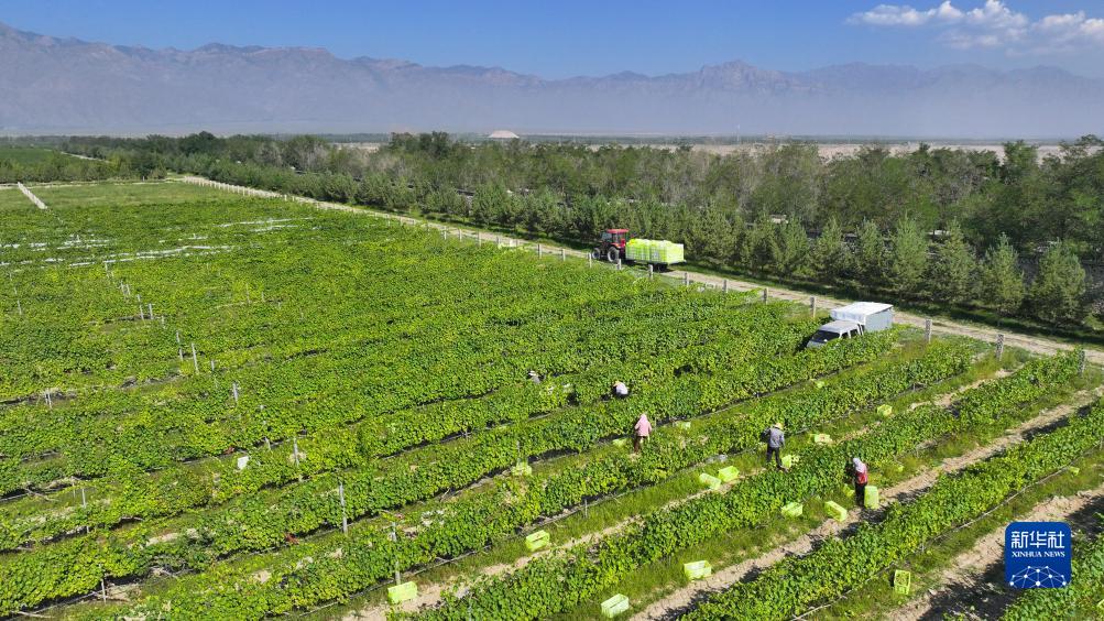 採摘工在位於賀蘭山東麓銀川市西夏區的志輝源石酒莊採摘釀酒葡萄(無人機照片,9月1日攝)。