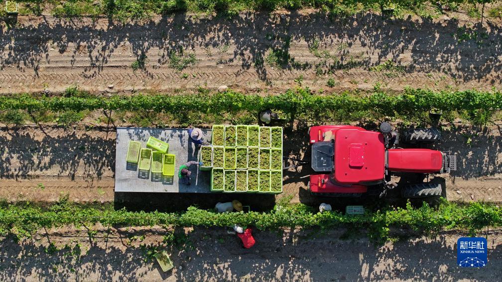 採摘工在位於賀蘭山東麓銀川市西夏區的志輝源石酒莊採摘釀酒葡萄(無人機照片,9月1日攝)。