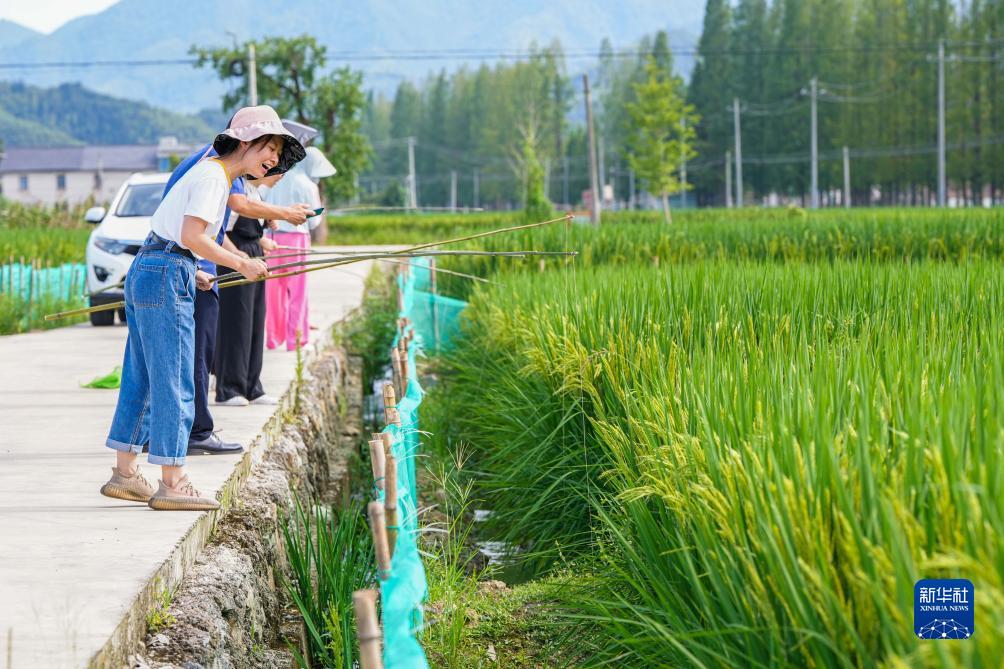 9月2日,游客在太陽鎮綜合種養水稻田裏體驗釣稻蛙的樂趣。