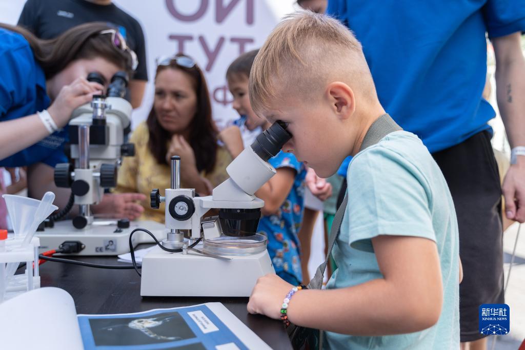 9月2日,在俄羅斯符拉迪沃斯托克舉辦的“知識日”活動上,一名兒童用顯微鏡觀察微生物。