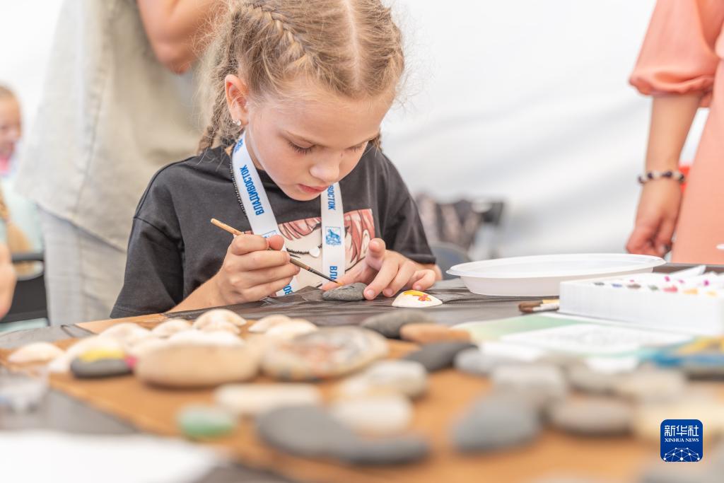 9月2日,在俄羅斯符拉迪沃斯托克舉辦的“知識日”活動上,一名兒童在石頭上作畫。