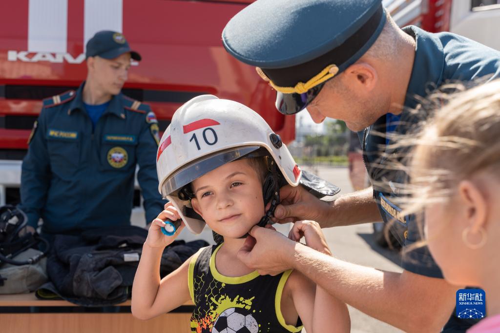 9月2日,在俄羅斯符拉迪沃斯托克舉辦的“知識日”活動上,一名兒童試戴消防頭盔。