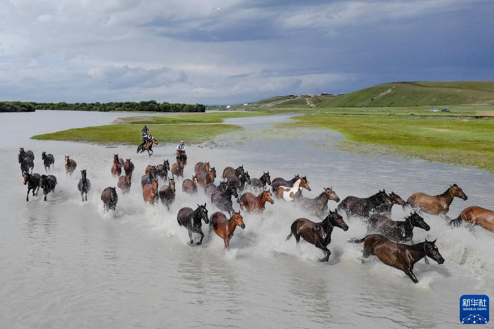新疆伊犁哈薩克自治州昭蘇縣濕地公園景區的“天馬浴河”景觀(7月17日攝,無人機照片)。