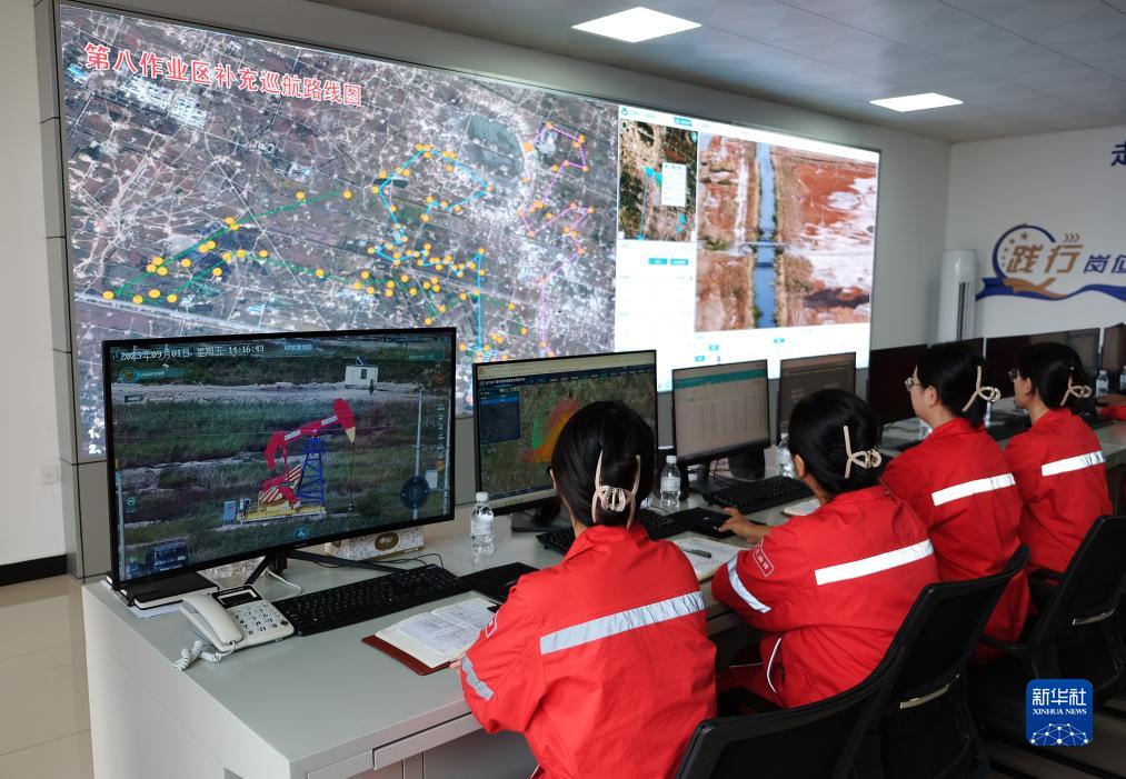 9月1日,工作人員在大慶石化公司第三採油廠第八作業區的生産指揮中心監測生産設備運行情況。指揮中心利用雷達、無人機等數字化手段,對油水井等設備設施進行巡檢,相較於傳統模式,其巡檢範圍更廣、效率和精準度更高。