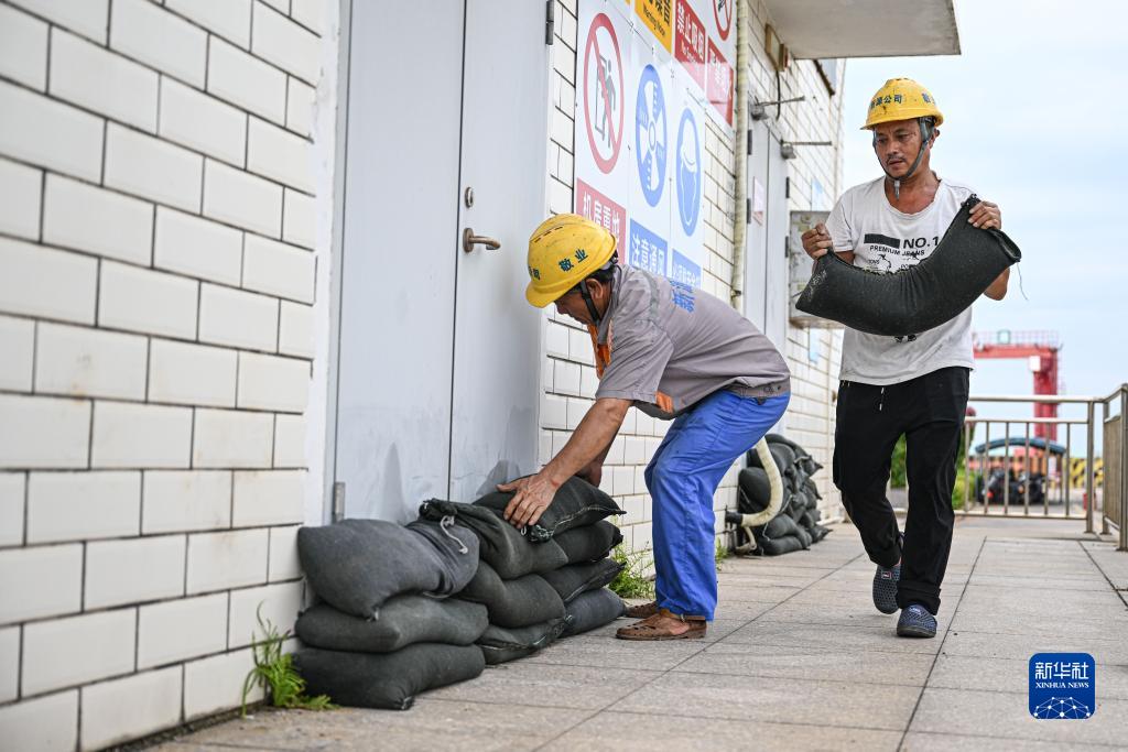 9月2日,工人在海南省海口市新海港一處機房門外放置防汛沙袋。