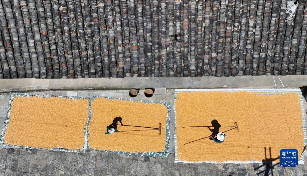 9月2日,在重慶市黔江區金洞鄉鳳&村葉家大院,村民在晾曬玉米(無人機照片)。