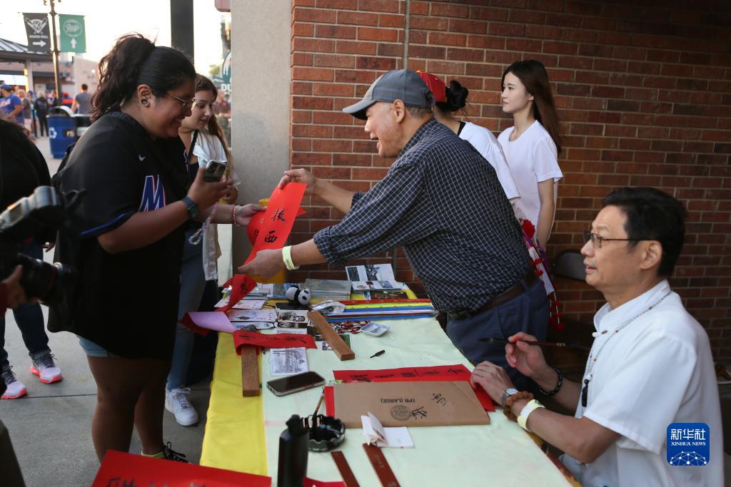 9月1日,在美國紐約大都會棒球隊主場花旗球場舉行的“中華之夜”暨“你好!中國”旅游推廣品牌發布活動上,工作人員向觀眾贈送“墨寶”。