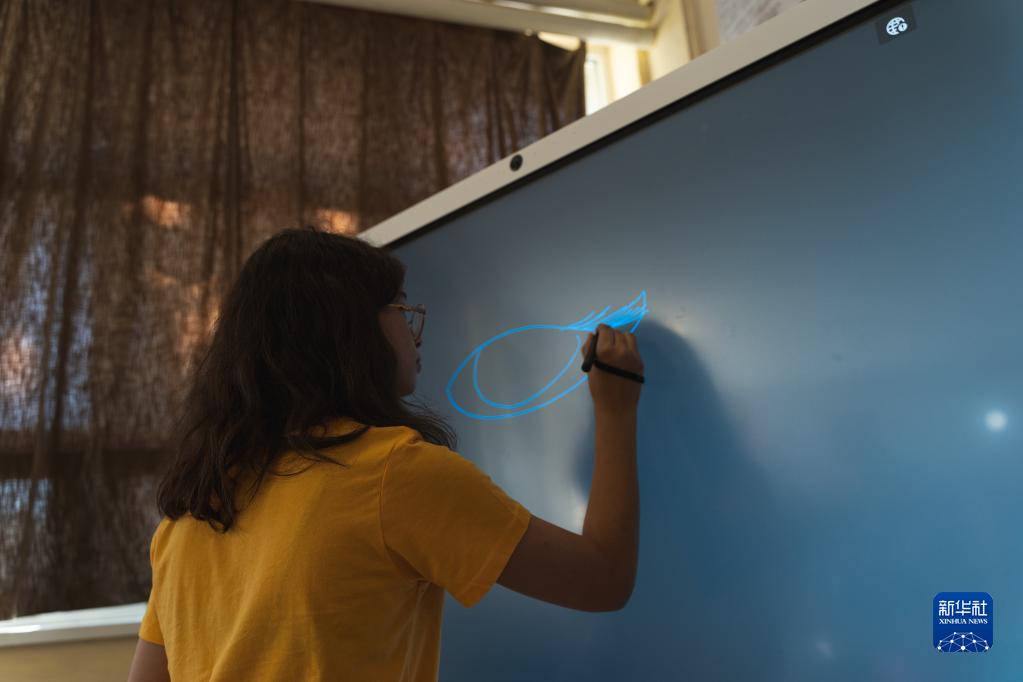 9月1日,在塞爾維亞北部伏伊伏丁那省的一所小學,一名學生使用華為智慧屏繪畫。