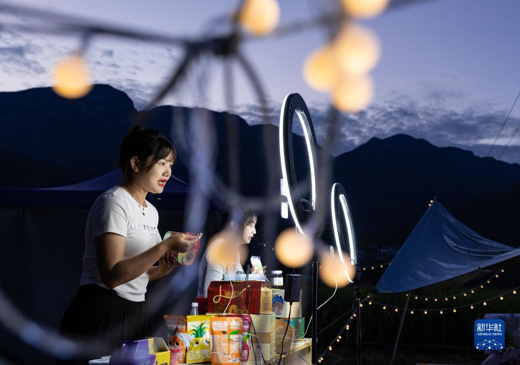 9月2日,在鹽邊縣惠民鎮興隆村的豐收後的稻田裏,兩位主播在直播推介當地農特産品。