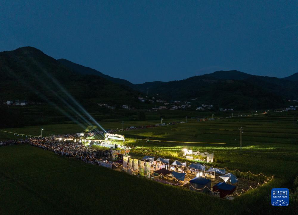 9月2日,在鹽邊縣惠民鎮興隆村的豐收後的稻田裏,一場傳承農耕文化的稻田音樂會正在上演(無人照片)。