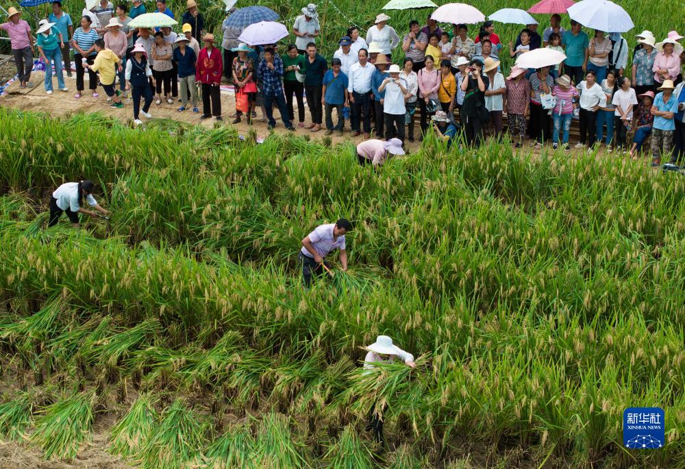 9月2日,在鹽邊縣惠民鎮興隆村的稻田裏,來自惠民鎮的村民在進行稻穀收割比賽(無人機照片)。