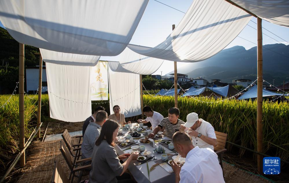 9月2日,在鹽邊縣惠民鎮興隆村的豐收後的稻田裏,幾位食客在享用當地傳統美食。