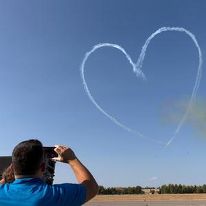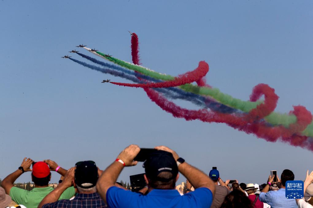 9月2日,觀眾在希臘塔納格拉空軍基地舉行的雅典飛行周上拍攝阿聯酋飛行表演隊的表演。