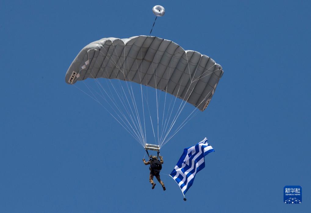 9月2日,在希臘塔納格拉空軍基地的雅典飛行周上,跳傘員在空中展示希臘國旗。