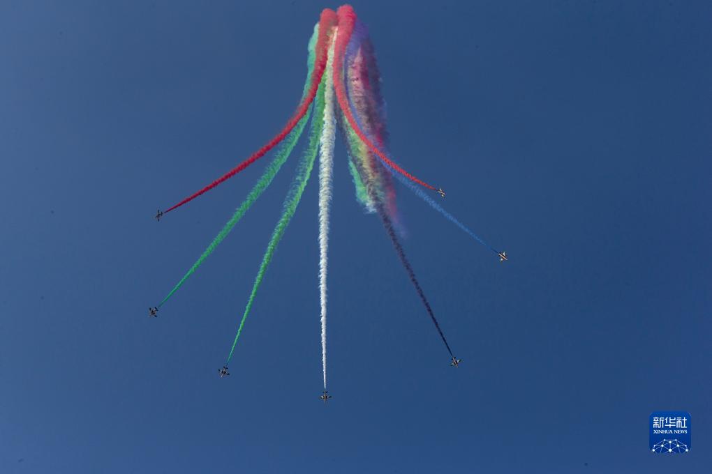 9月2日,在希臘塔納格拉空軍基地的雅典飛行周上,來自阿聯酋的飛行表演隊進行表演。