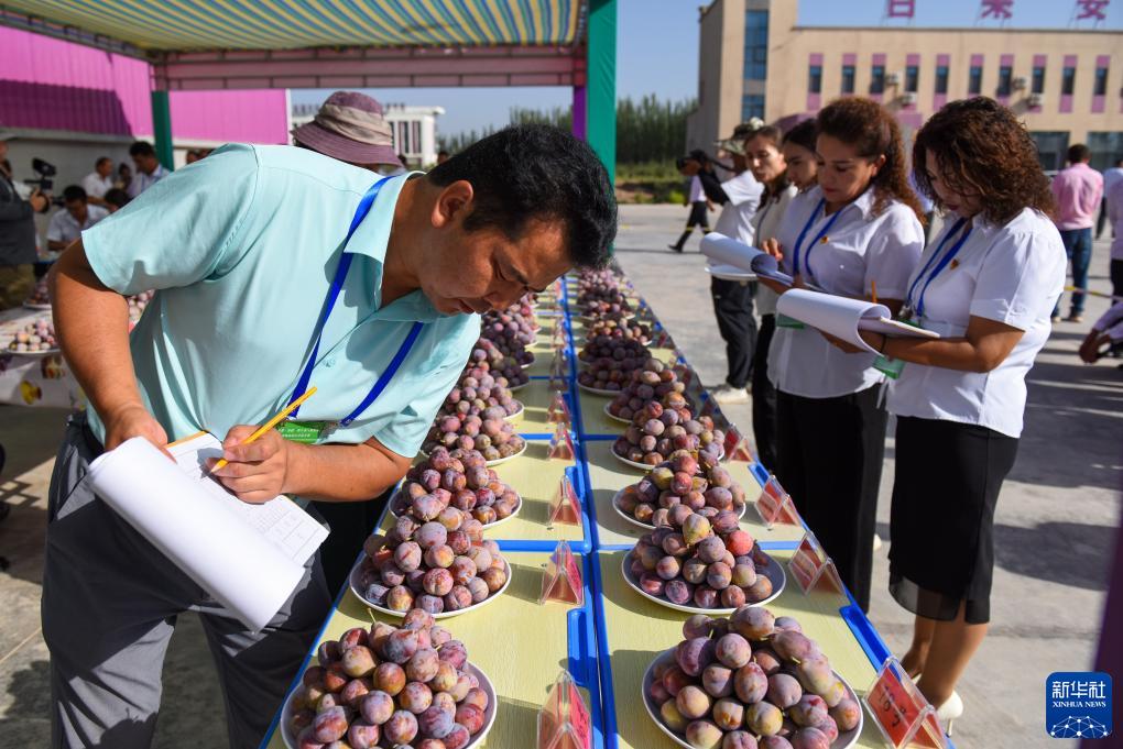 在新疆伽師縣粵伽新梅産業園舉行的伽師新梅展銷會評選大賽現場,評委為參賽新梅打分(8月4日攝)。