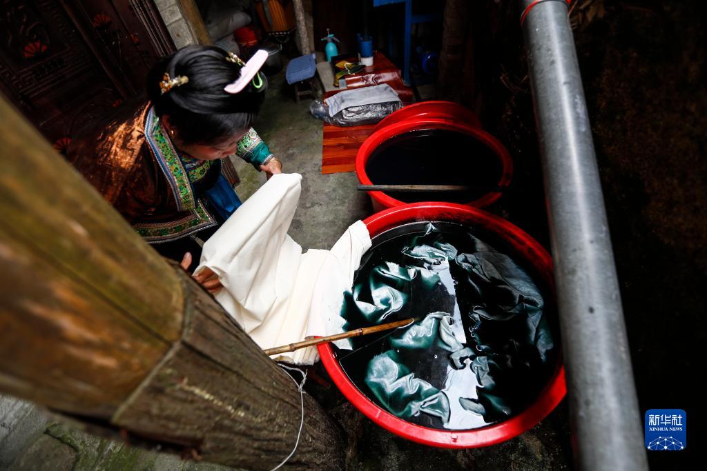 烏英苗寨婦女梁足英將白布浸染(2023年8月31日攝)。新華社記者 胡星宇 攝