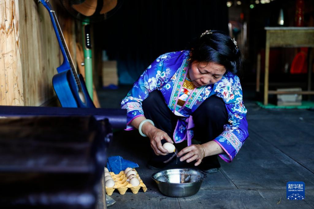 烏英苗寨婦女梁足英在取雞蛋清,準備給布料塗抹(2023年8月30日攝)。新華社記者 胡星宇 攝