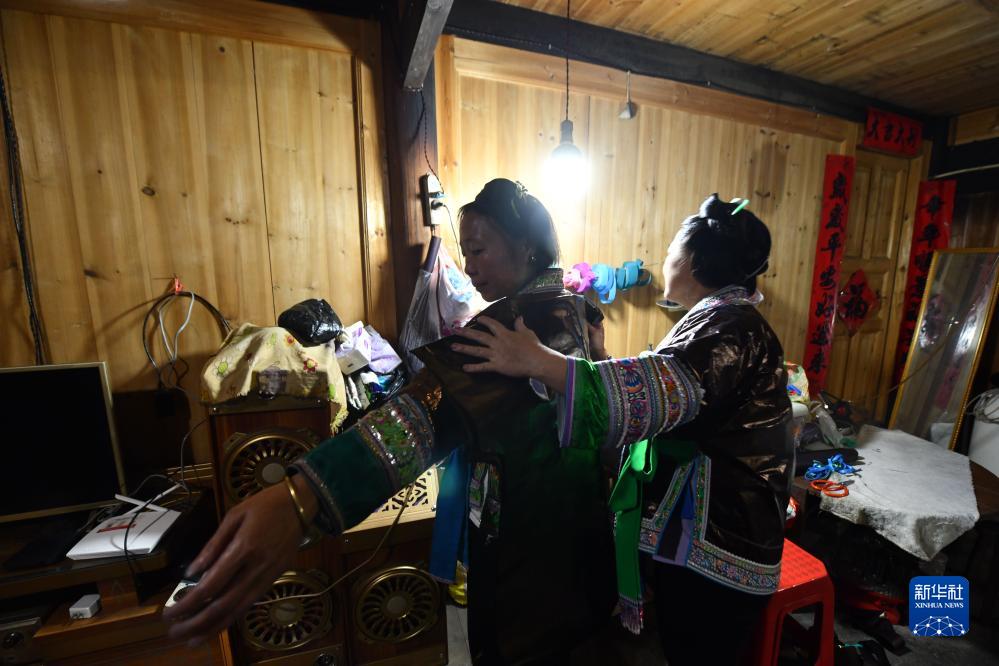 烏英苗寨婦女梁足英(左)、吳妹秋準備縫製亮布衣服,這是吳妹秋在給梁足英量身(2023年8月31日攝)。新華社記者 黃孝邦 攝