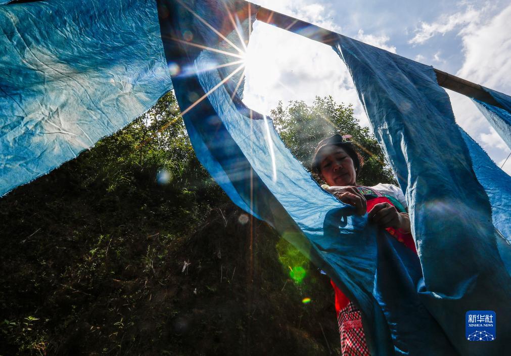 烏英苗寨婦女梁足英在晾曬第一次浸染後的布料(2023年8月31日攝)。新華社記者 胡星宇 攝
