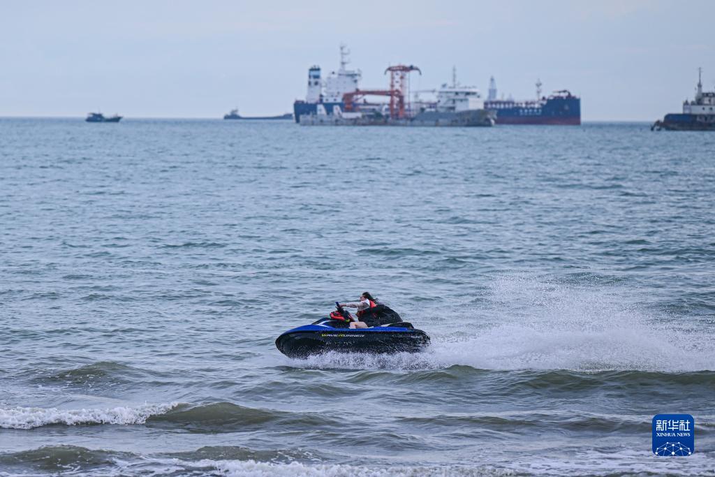 游客在海南省三亞市三亞灣體驗水上項目(8月30日攝)。三亞灣位於海南省三亞市主城區南部,海域面積75平方千米,是三亞市作為著名旅游目的地的重要資源依託。