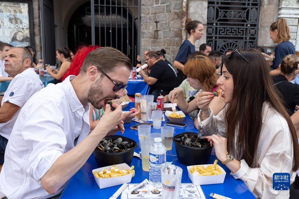 9月2日,人們在法國北部城市裏爾品嘗貽貝。裏爾舊貨市場上,“貽貝-薯條-啤酒”的組合是游客們的最愛。