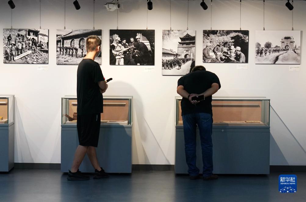 9月3日,參觀者在中國人民抗日戰爭紀念館觀看“烽煙號角——《晉察冀畫報》攝影文獻展”。