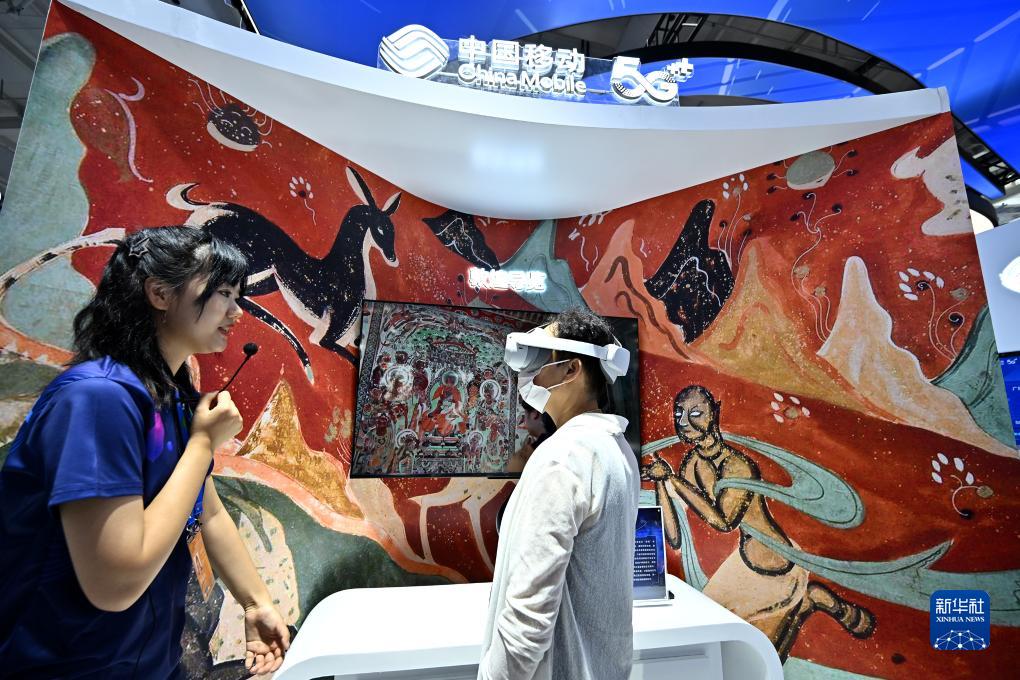 9月3日,一名參觀者在首鋼園中國移動展&體驗基於AR/VR特效的敦煌導覽,沉浸式感受敦煌壁畫的魅力。