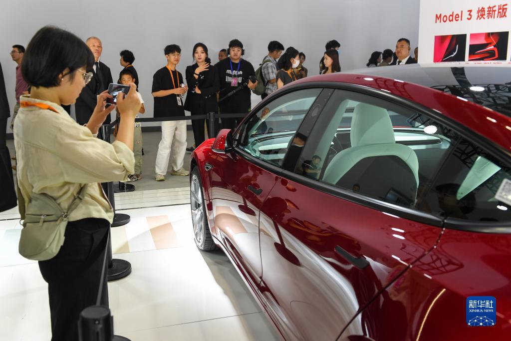 9月3日,在國家會議中心的特斯拉公司展&,參觀者在了解特斯拉展出的新款電動車。
