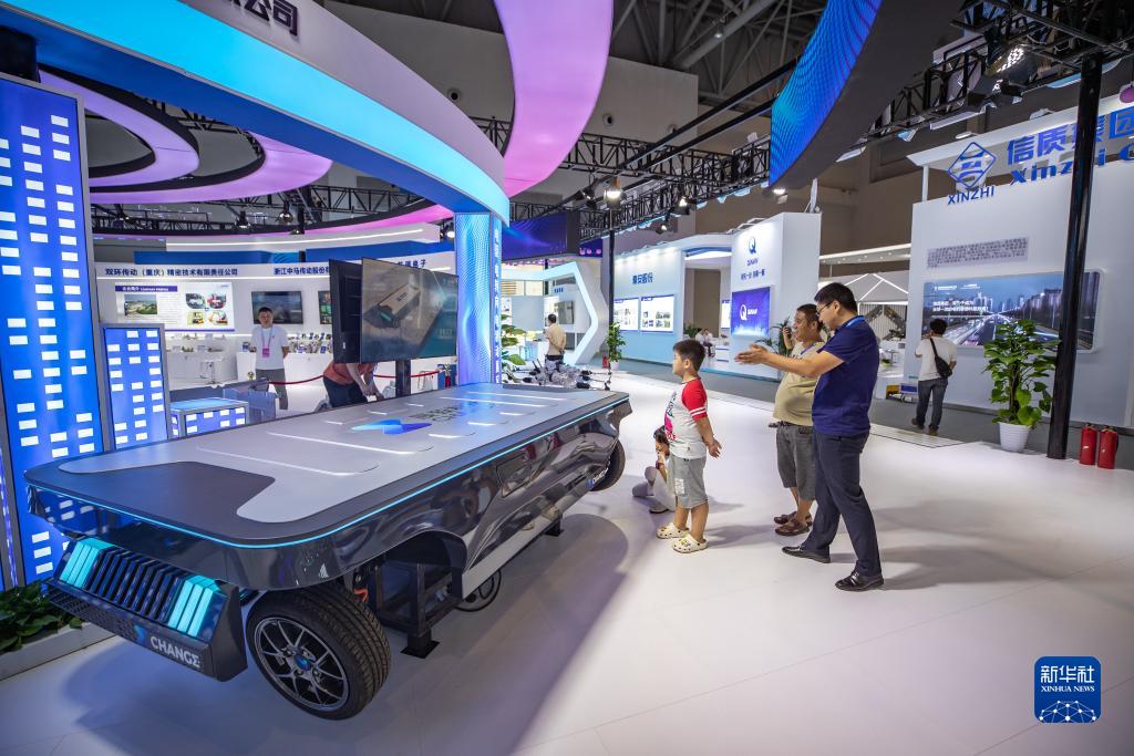 9月3日,嘉賓在2023中國國際智能産業博覽會展廳內參觀智能汽車滑板底盤産品。