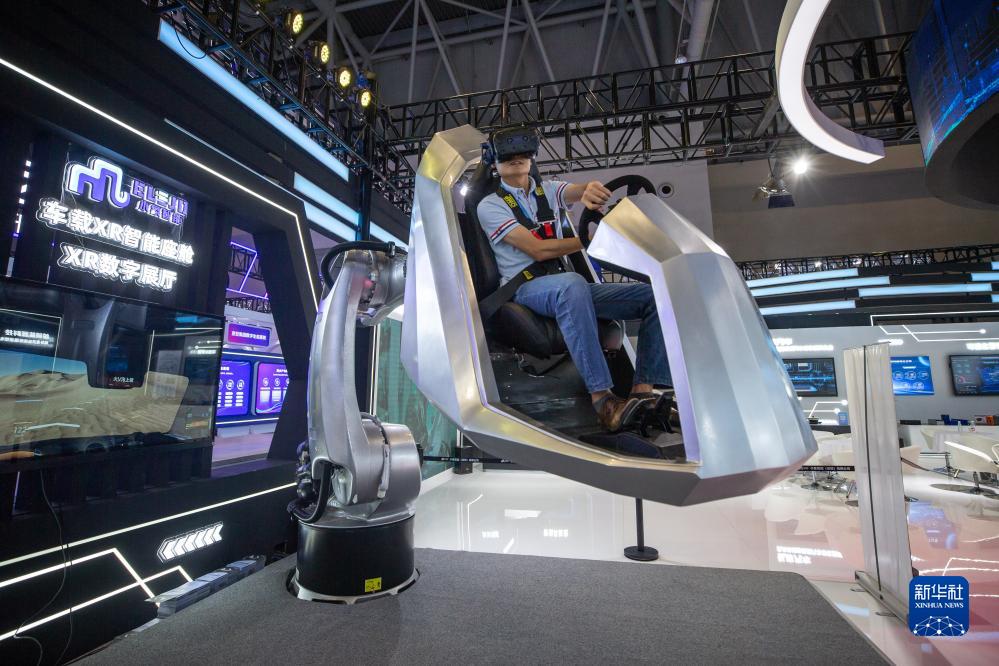 9月3日,媒體記者在2023中國國際智能産業博覽會會場內體驗車載XR智能座艙。