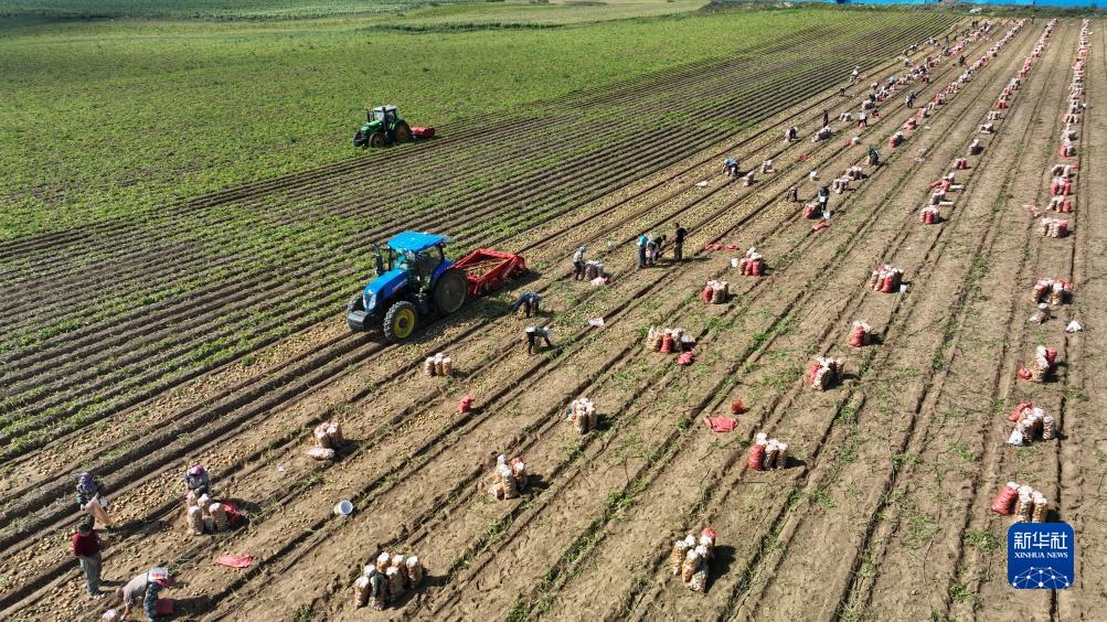 9月3日,河北省圍場滿族蒙古族自治縣禦道口鎮禦道口村一家馬鈴薯種植合作社社員在收穫馬鈴薯(無人機照片)。