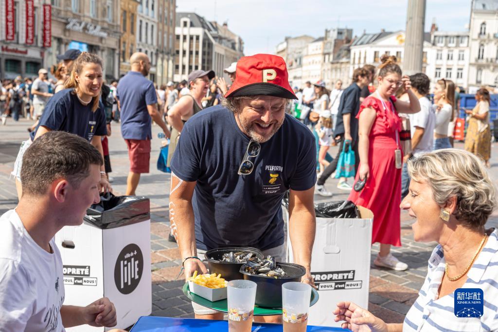 9月3日,在法國裏爾舊貨市場上,服務員為顧客端上新鮮出爐的貽貝。