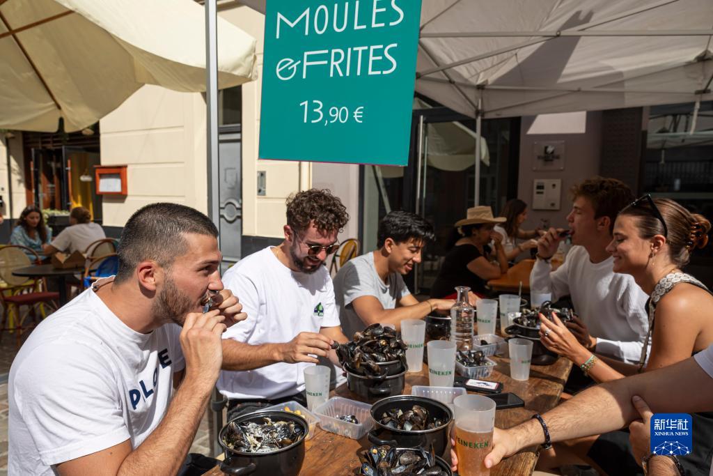 9月3日,在法國裏爾舊貨市場上,人們享用貽貝和啤酒。