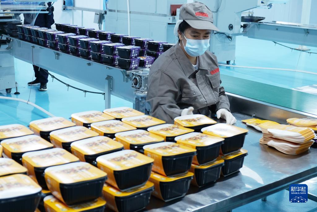 9月4日,在位於綏化市慶安縣的黑龍江倍特食品有限公司生産車間,工作人員在加工製作自熱米飯。