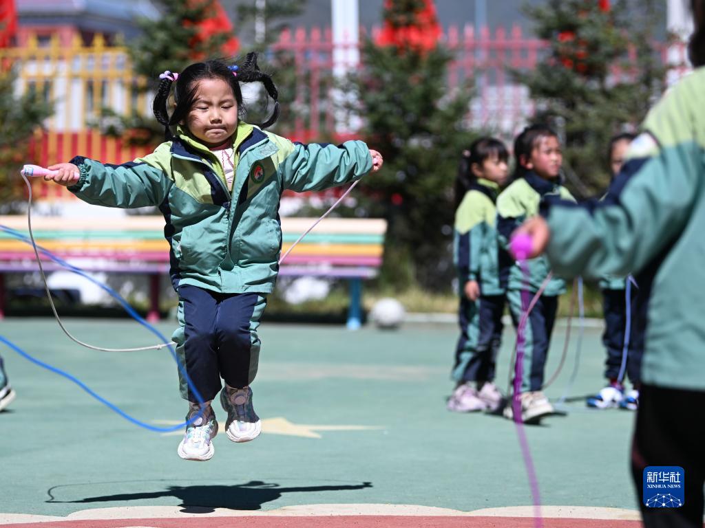 9月4日,青海省果洛藏族自治州瑪沁縣大武幼兒園小朋友在跳繩。