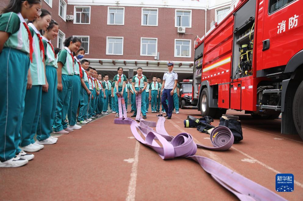 9月4日,承德市雙橋區竹林寺小學學生在消防救援隊員指導下體驗使用消防器材。