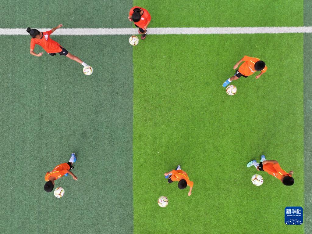 9月4日,在長沙市南雅望城學校,學生在開學典禮上表演足球顛球(無人機照片)。