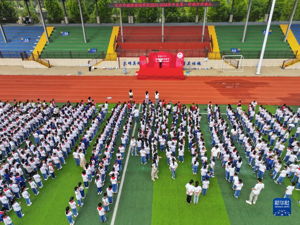 9月4日,在長沙市南雅望城學校,學生在參加開學典禮(無人機照片)。