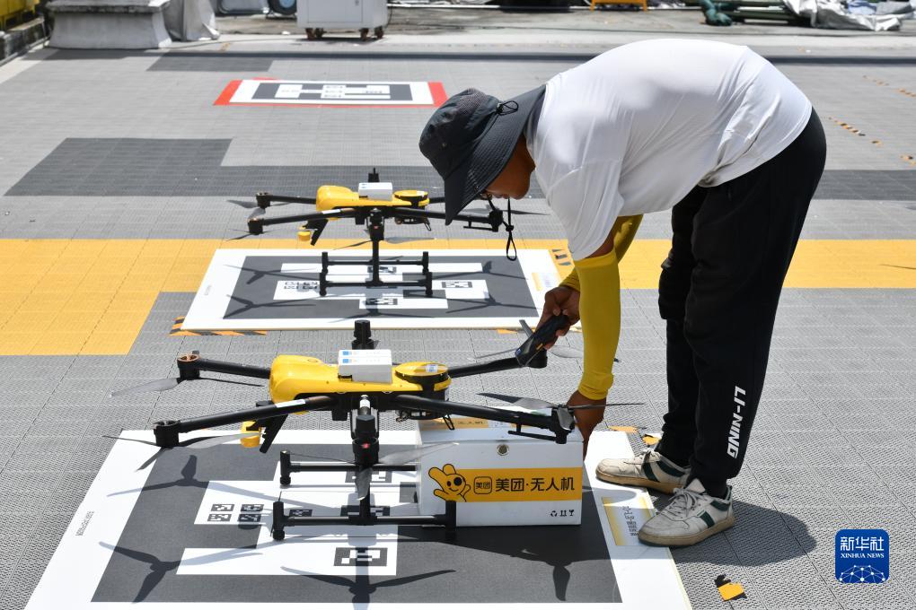 在深圳市龍崗區一處無人機起飛場,工作人員準備挂載餐箱(8月15日攝)。