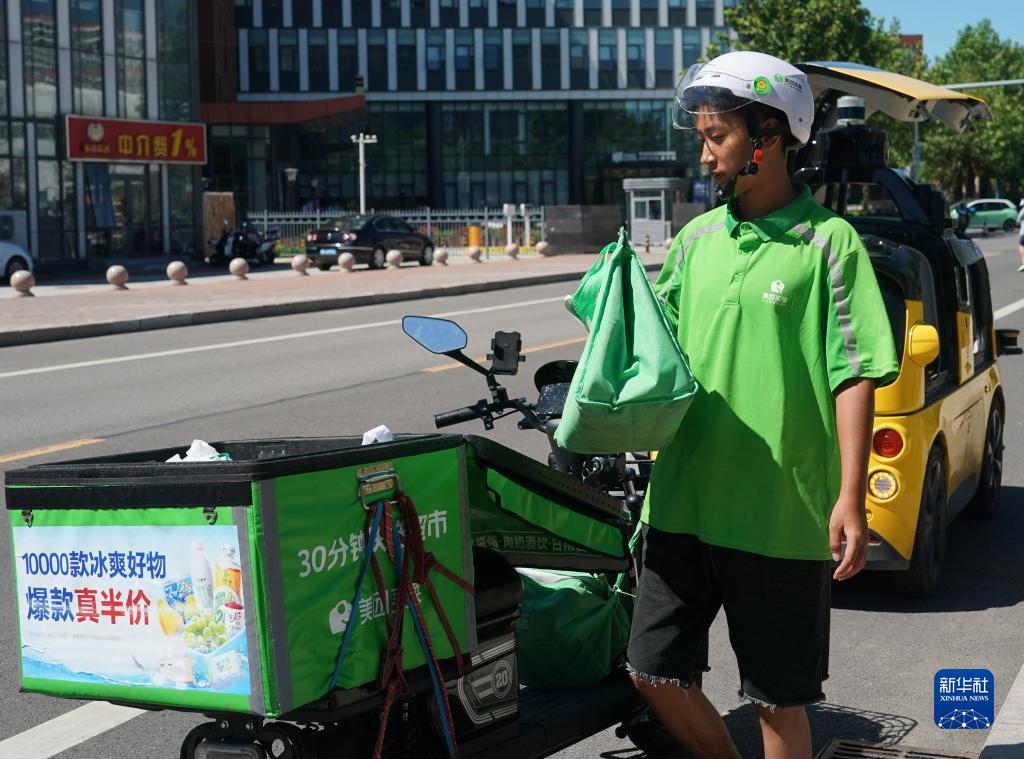 在位於北京市順義區的一處自動配送車指定停靠點,一名騎手取走自動配送車中的訂單準備送至顧客手中(8月22日攝)。