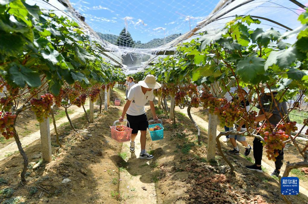 9月3日,游客在湖北省宣恩縣椒園鎮一採摘園裏採摘葡萄。