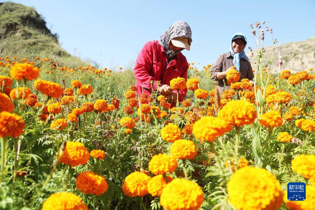 9月4日,農民在甘肅省定西市隴西縣馬河鎮賀家川村採摘萬壽菊。