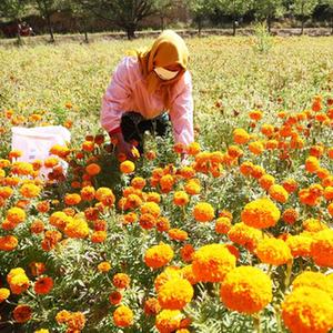 初秋時節,甘肅省定西市隴西縣4萬畝萬壽菊進入採摘期,農民們趁着晴好天氣採摘、裝車、出售,田間地頭一派忙碌景象。